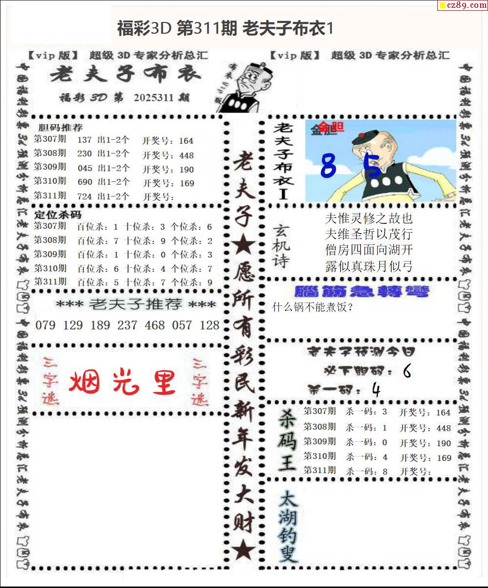 老夫子布衣2025311期3d图谜